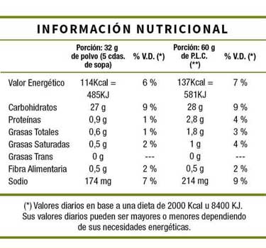 Rinde 14 porciones Cocción: 50' 60' Peso Neto: 500 gr. Polvo para preparar bizcochuelo sabor a Vainilla. Libre de Gluten.