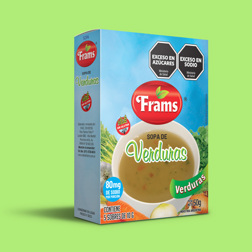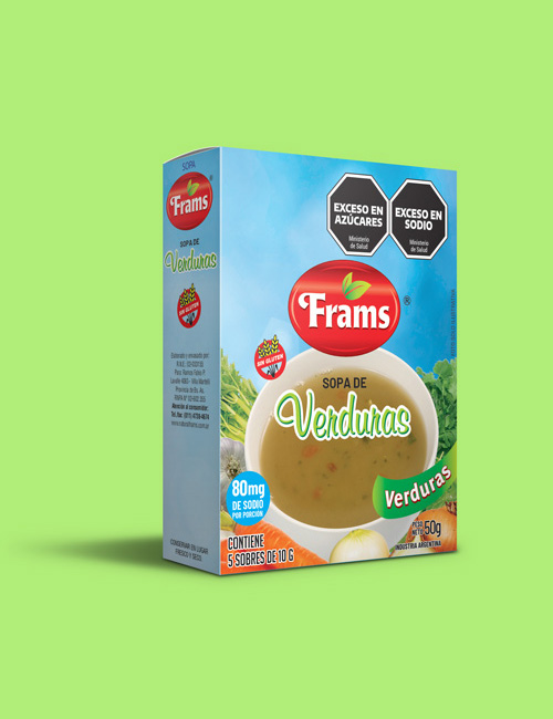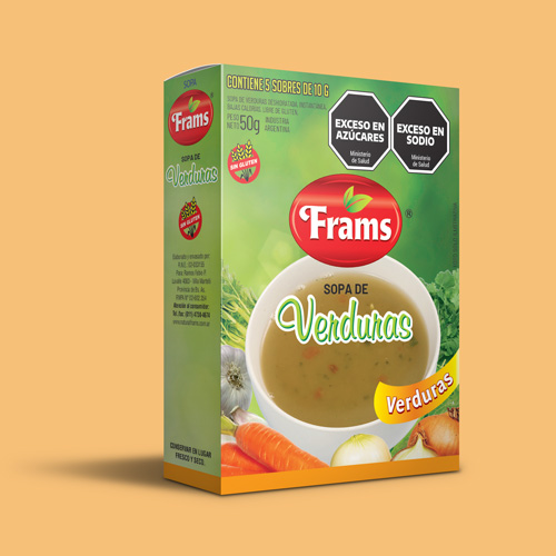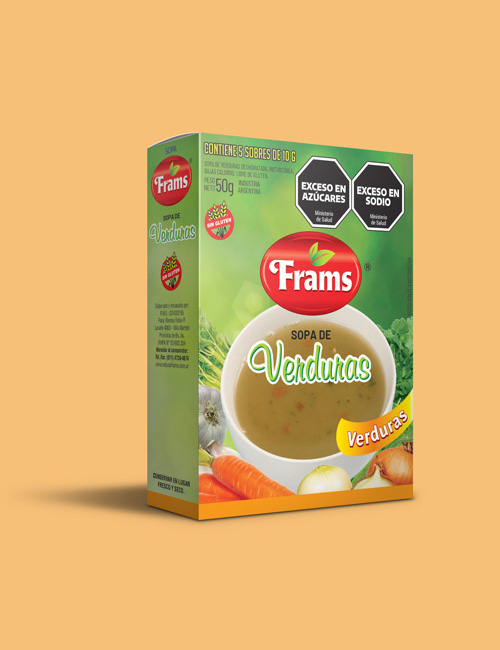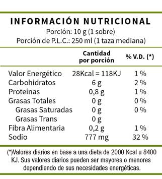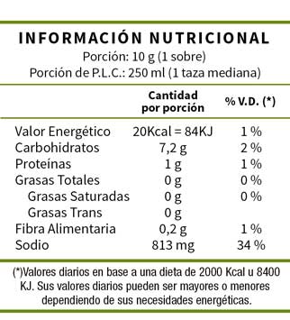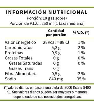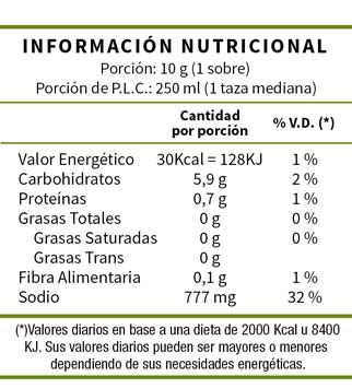 5 sobres de 10 gr Peso Neto: 50 gr. Sopa de Verdura sin sal deshidratada, instantánea y de bajas calorías. Libre de Gluten.