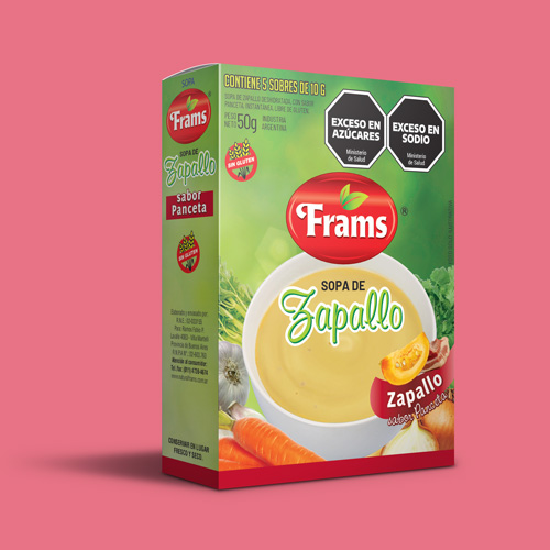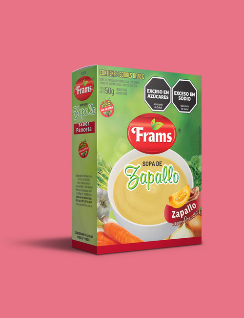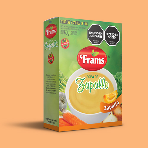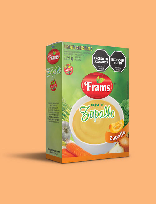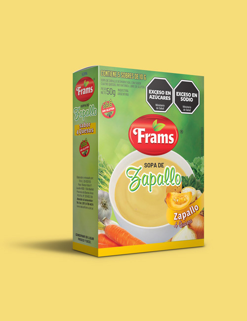 5 sobres de 10 gr Peso Neto: 50 gr. Sopa de Zapallo 4 Quesos deshidratada, instantánea y de bajas calorías. Libre de Gluten.